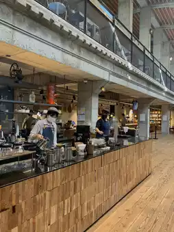 The spacious interior, reminiscent of a renovated factory, is impressive. The high ceilings and open space create a welcoming atmosphere, while the vintage yet sophisticated interior makes a cup of coffee even more special. The sunlight streaming through the large windows makes for great photo opportunities.