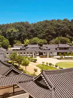 The entire design of Seongyojang House reflects the traditional Korean philosophical principle of harmonizing man-made structures with nature. The complex is beautifully situated within a natural, secluded setting near Gyeongpo Lake (which, historically, was accessible by boat—hence the name "Seongyo," or boat crossing). The estate is enveloped by lush greenery and mature trees, creating a sense of balance and tranquility. The curved roofs and extensive wooden framework are positioned to maximize the flow of air and light, ensuring that the peaceful natural environment is a continuous part of the living space.