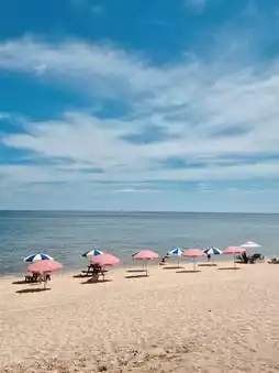 Sungut Beach (순긋해변) offers a wonderfully tranquil escape on the East Coast of Korea. Its primary charm lies in its smaller, more intimate scale compared to its larger neighbors. The beach view is immediately striking: a beautiful arc of white sand meeting the crystal-clear, emerald-blue waters of the East Sea. The environment here is noticeably clean and well-maintained, giving the feeling of stepping into a pristine natural sanctuary.