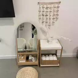 The room is decorated in white and wood, creating a comfortable atmosphere, and the accessories add a touch of whimsy.