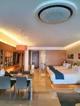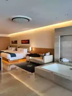 There are 2 double beds, a jacuzzi, a table, etc. in the room itself.