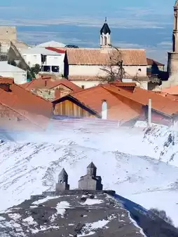 ✅Or stroll through the town, experiencing the local tranquility and simplicity; you can also climb to the viewing platform to appreciate the magnificence of the Caucasus Mountains.