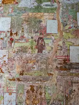 The murals of Kaifa Temple also depict the life of court nobles. For example, one mural tells the story of a prince who cares about the people, suffers hardships, and returns home after being exiled to a foreign country. The mural focuses on the scene of the prince's glorious return, with the king, queen, and ministers celebrating together. The palace is magnificent, and the ministers hold tablets to celebrate, creating a joyful and harmonious atmosphere.