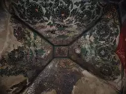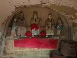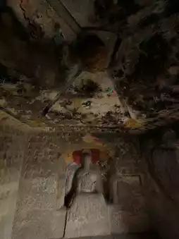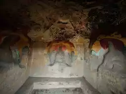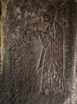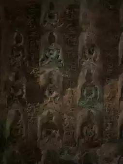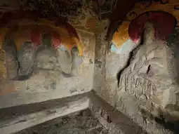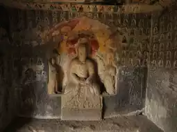The grottoes face south with their backs to the north. Currently, 6 caves remain, with caves 1, 2, and 3 from the west being Buddhist caves featuring Northern Dynasty grotto statue styles. They all have rectangular floor plans with inverted-bowl shaped ceilings decorated with painted lotus flower patterns. The cave entrances are rectangular with flame-shaped lintels, and two guardian figures carved on both sides of the doors. Inside Cave No. 3, low platforms are set on all four sides, with niches for Buddha statues carved into the north, east, and west walls. Each niche contains one Buddha with two attendants. The outer walls of the three niches are fully carved with thousands of Buddha images, and the names of donors are inscribed on both sides of the door on the south wall. About 60 meters to the east, there are 3 more stone caves. Two of them were carved in the 32nd year of the Wanli period of the Ming Dynasty (1604), with inscriptions reading "Three Teachings Cave," "Three Virtues Cave," and "High Cave." The clay sculptures inside these caves have been completely destroyed. Currently, 3 stone tablets recording the creation of these three caves still remain.