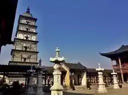 The Guo Si Pagoda is a square, seven-story pavilion-style brick pagoda, with a bronze cast gourd on the top, which is engraved with the eight characters 'Feng Diao Yu Shun, Guo Tai Min An'.
