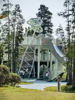 Various climbing frames, slides, nets, zip lines, kids have a blast