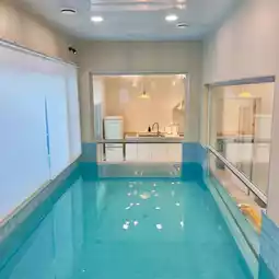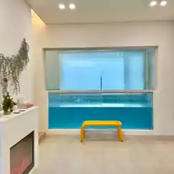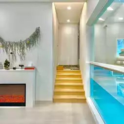 a transparent heated pool and a wood-fired fireplace,