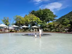 There is no swimming pool, but you can play in the water at the water park inside the resort.