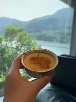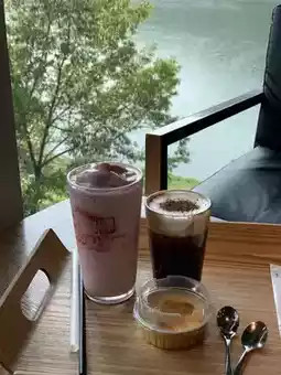 Enjoy a drink with a wide-open glass window view surrounded by nature for a complete healing experience! They even serve the trendy crème brûlée these days. 🫶