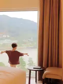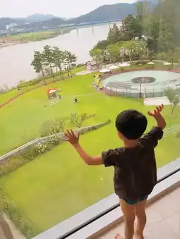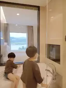 The living room has two walls with large windows, and the bedroom also has a large window, so the view is amazing. When you open the door, there is a river view, and to the side, a mountain view. The first picture is a view of the foggy mountain. There is a TV in the bathroom whirlpool, so there are three TVs in total. Thanks to this, the kids enjoyed their bath. The terrace is also quite spacious.