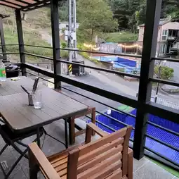 It's a 3-story private pool villa pension! There's a kitchen and dining table on the 1st floor, an arcade/spa/sofa/indoor pool/BBQ terrace on the 2nd floor, and a bed on the 3rd floor. The indoor pool is much wider and deeper than you'd think, so it's great for swimming privately. There's a barbecue facility on the pension terrace, so it's convenient to go back and forth. There's also an outdoor pool, but it's not open in October because it's too cold!