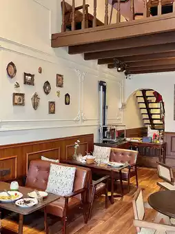 The café boasts a vintage European aesthetic, featuring whitewashed interiors, wooden accents, and soft lighting. This setting creates a warm and inviting atmosphere, perfect for leisurely meals and photo opportunities. The Jalan Trus outlet, in particular, is a two-story establishment that exudes old-world charm.