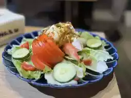 The menu features both Osaka and Hiroshima-style okonomiyaki, and I went with the seafood Hiroshima version. It was well-prepared, flavorful, and layered just right. A real comfort dish done properly. The green salad was also refreshing — crisp greens topped with creamy potato salad, cherry tomatoes, and finished with a classic wafu dressing that tied everything together nicely.