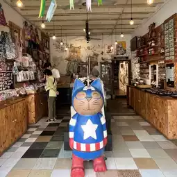 A cute shop with only cat collectibles. We can walk around the inside of the shop. There are many cat collectibles in display cases or photo frames. There are art works on the walls. There are many beautiful photo spots here. The shop sells souvenirs and items with cat pictures at affordable prices. The shop owner is kind enough to let us take pictures for free and there is no entrance fee.