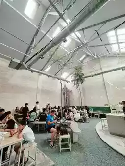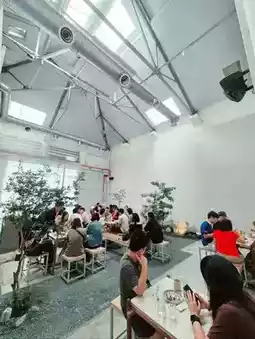 The entrance door is very large. Inside the shop, the atmosphere is chill, airy and comfortable.