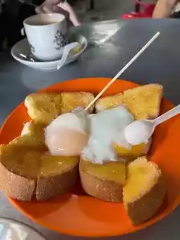 A local breakfast cafe that you must not miss when visiting Penang. I love it so much. The shop is located in a small alley, but there are always a lot of people queuing up. The menu is easy to order with pictures. 555 We just point. The main menu is toast, kaya, and soft-boiled eggs. There are many flavors of toast and kaya to choose from. We ordered: