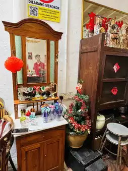 From the moment I stepped in, Loong Fong Terrace felt like stepping into an old Hokkien uncle’s home. There were roosters on the cabinet, fortune posters on the wall, and a mirror surrounded by everyday items. You’ll find everything from lip balm to pens neatly arranged like a quirky art installation.