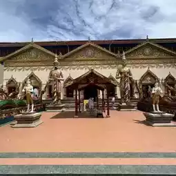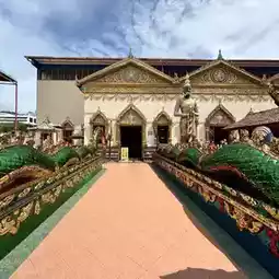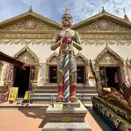 - Walk around the **colorful prayer halls** with intricate Thai-style murals.
