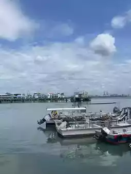 On a sunny day, the wooden planks glow warm under golden light, the turquoise sea sparkles, and fishing boats float like colorful dots against the horizon — perfect for postcard shots. 📸