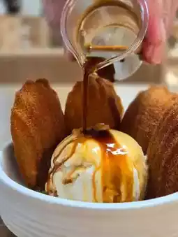 For dessert, I chose the Butterscotch Madeleine. Four madeleine cakes were served with a scoop of ice cream, accompanied by a shot of espresso to pour over. The presentation added a touch of ceremony. I recommend eating the madeleines first, as soaking them too much in coffee can make them overly wet and bitter. The ice cream paired perfectly with the coffee, as expected.