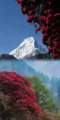 - **Snow-Capped Backdrop**: With the eternally snow-covered Annapurna and Machhapuchhre peaks in the background, the combination of red flowers, white snow, and blue sky creates a heavenly scene. 🏔️