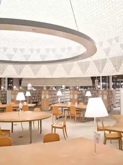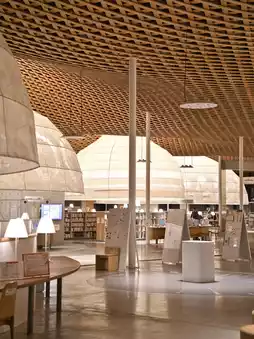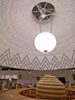 It features a unique design resembling a large umbrella, and the library's generous use of wood creates a warm and inviting atmosphere. 😌