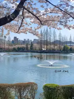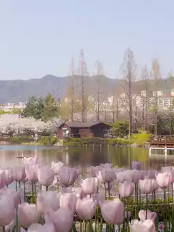Yeonji Park is great because it has a lake and a trail in addition to cherry blossoms and tulips
