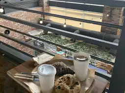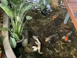 The cafe has two floors, and there's a small stream on the first floor filled with fish, which is a favorite spot for kids.