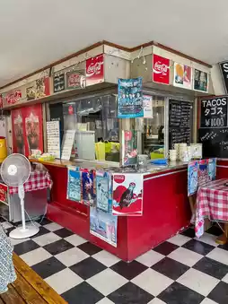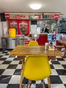 Unlike the simple exterior, the interior of the restaurant has an American atmosphere.