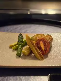 ◼️ Teppanyaki seasonal vegetables (asparagus, white eggplant, baby corn, Sicilian rouge) with raw soy sauce and wasabi