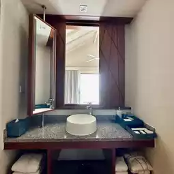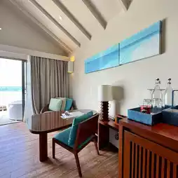 Deluxe overwater villa room with a mini bar inside