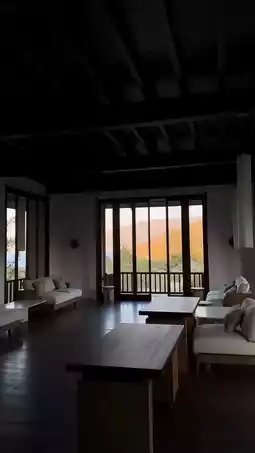 The hotel's design is inspired by local traditional architecture, with independent modern stone pavilions and a country-style layout, offering stunning views of forest sunrises and coastal sunsets.