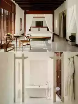 The resort has a 50-meter-long marble infinity pool where you can swim and enjoy the magnificent sea view. In addition, the hotel also has tennis courts, a gym, a yoga room, and even a three-story library for you to spend a leisurely afternoon.