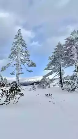 Upon arriving at Peacock Mountain, I was greeted by a scene of pristine beauty after a fresh snowfall. The mountains were gently covered in snow, resembling a maiden draped in a rose-colored veil, gentle and serene. Sunlight pierced through the clouds, and the snow reflected diamond-like sparkles, dazzling yet captivating. The distant "Tianxin Twelve Lakes" were as clear as mirrors, reflecting the snow-capped mountains and the blue sky. The interplay of light and shadow created a dynamic, ink-wash painting-like scene.