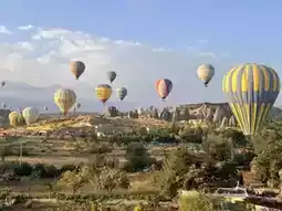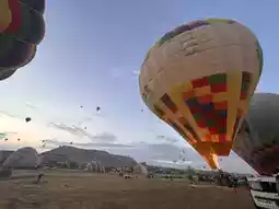 The balloon takeoff point and the sky near Goreme. By watching from the top of the hill or from inside the balloon, you can get a panoramic view of the morning sunlight painting the strange rock area golden