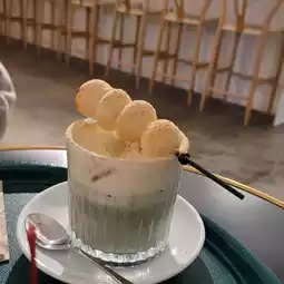 The pudding is rich. It's not a watery, machine-made pudding. It has a rich, milky flavor that lingers in your throat! The Cream Mugwort Latte is topped with chewy dango (Korean rice cake) sweets.