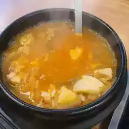 The kimchi jjigae is filled with chunks of pork and is incredibly delicious!