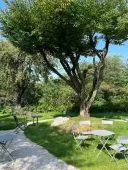 There is a garden with big trees.