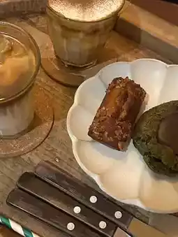 I came to La Festa and found a cute cafe. Haha. I used to love kaymak, so I've been to a few cafes with this kind of Western style. I'm so happy that a cute, unique cafe with a refreshing vibe has opened near my house at La Festa. The coffee prices here are reasonable, and you can even choose from three different beans, so you can customize your experience! The desserts all look delicious, and the crunchy ones are amazing! Sweet and savory, perfect for my taste >.<🧁🍨