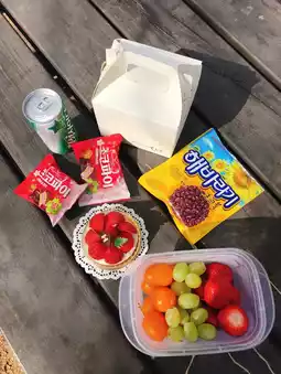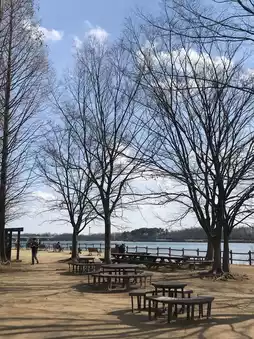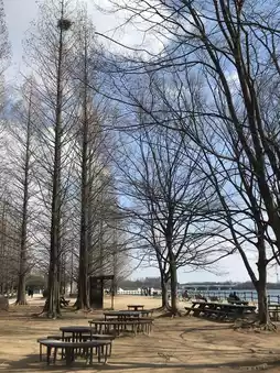 Just pack some snacks and fruit from home and come out to the lake park to eat, that's a picnic! Enjoy a picnic on a bench under an exotic pointed tree. There are many benches and tables so you don't have to lay down a mat, so it's great to eat your lunch while enjoying the view!