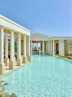 Inspired by ancient Greek temples, the resort features a central mirror pool that creates a tranquil atmosphere. It includes 38 standalone Pavilions, Beach Cabanas, and 12 luxurious Villas of varying sizes, ensuring deep privacy.
