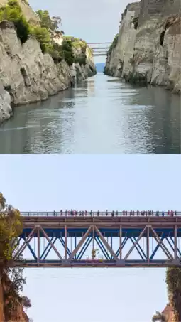 🌉 Corinth Canal: An engineering marvel connecting the Aegean and Ionian Seas. From the bridge above, you can see ships sailing through the narrow, deep, and incredibly long straits.