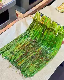 Charcoal-grilled, crispy and tender with a chewy texture.