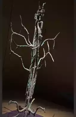 Bronze mask with protruding eyes, bronze sun-shaped artifact (steering wheel), bronze sacred tree, bird-footed statue