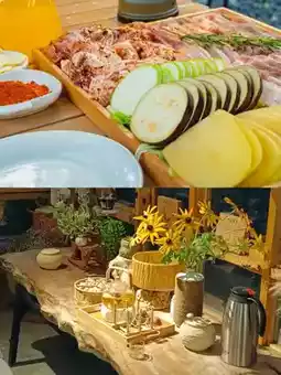 🌲 The exterior view of the courtyard is comfortable and natural, and the starry sky ✨ at night is even more pleasant. Breakfast is home-style, with corn 🌽, bean porridge, steamed buns, and eggs 🥚. For lunch and dinner, you can have Chinese food, barbecue, and hot pot 🍲.