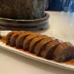 Next was the Queyuan Honey Lotus Root. This dish uses fresh lotus root, which has moderate sweetness and a crispy skin. It is paired with glutinous rice and osmanthus honey, making it irresistible. And this dish looks very beautiful too.