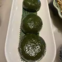 The last one is the mugwort cake. This snack has a dense texture, the aroma of mugwort wrapped with black and white sesame fillings. It has moderate sweetness and is very suitable to be enjoyed as a dessert.