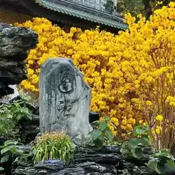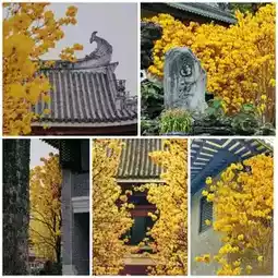 Blooming brilliantly, the pavilions and eaves are flying, the courtyard is quiet, the red walls and green tiles are matched with yellow flowers