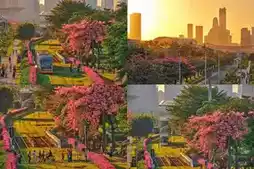 The pink kapok blossoms show a different charm under the sunset glow The tram weaves through the blooming pink sea of kapok, making one doubt if they have stepped into an anime world