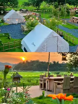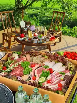It is especially suitable for escaping from the fast-paced life atmosphere and coming here for a leisure vacation. There are camping tents where you can see the stars, a single-family yard, a mushroom-shaped house... There are also outdoor kitchens and hot springs, and the supporting facilities are complete. Hiking in the mountains and rivers & kayaking and off-road vehicles. There is a hiking trail around the mountain behind the resort, which is very suitable for outdoor walks. You can see bamboo forests, pond fish, and streams along the way. It takes about 30 minutes to complete the loop. There is also a large lake in the back mountain of Miao. You can go to the back mountain to kayak and drive an off-road vehicle to enjoy a leisurely time. Exquisite picnic camping does not require any equipment! You need to bring equipment, no tent, and you can experience the fun of camping and barbecue!
